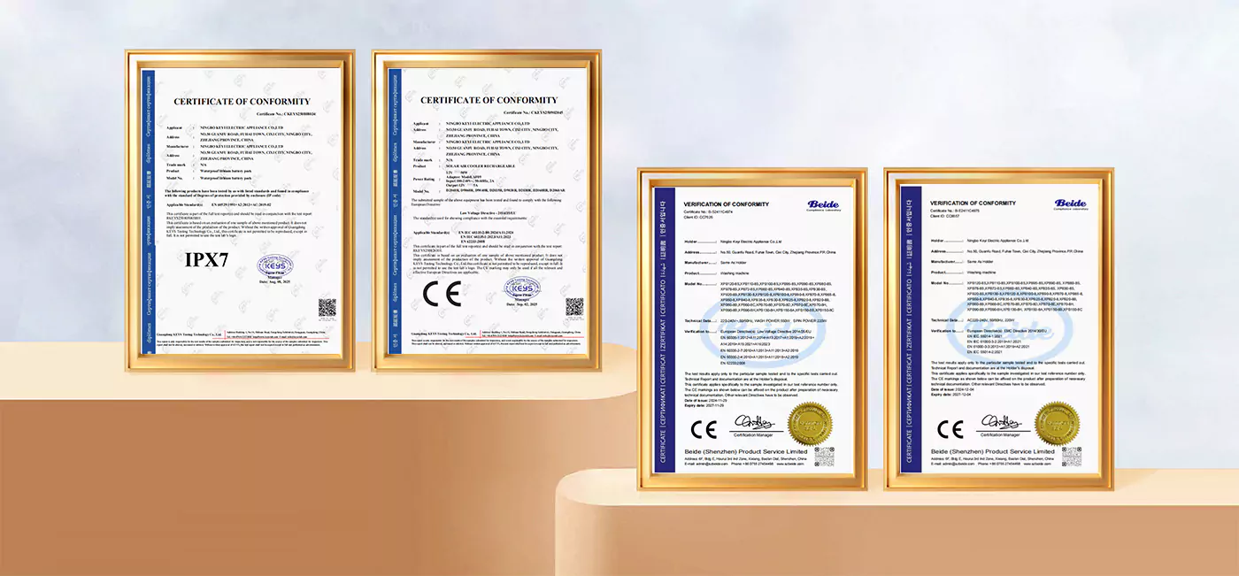 Нашите машини за перење и воздушни ладилници ги поминаа стандардите за тестирање на ЕУ и добија CE сертификат. Батеријата може да се пофали со водоотпорна оцена IPX7. Ние сме исто така сертифицирани како извонреден продавач на домашните платформи за е-трговија и Alibaba.